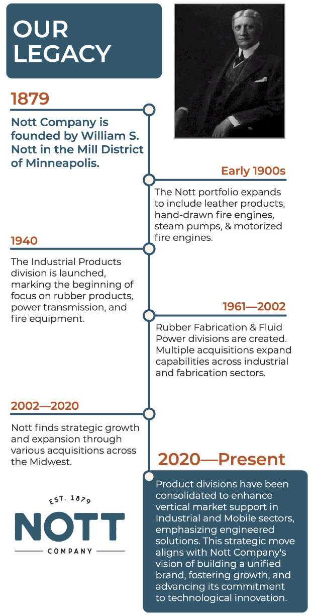 Founded in 1879 by William S. Nott, Nott Company began by producing leather drive belts for the thriving milling and lumber industries in Minneapolis. Early products were made from animal hides and powered by the water from St. Anthony Falls on the Mississippi River. Over time, our portfolio expanded to include horse harnesses, leather dice cups, and even hand-drawn and motorized fire engines. Reminders of this innovative heritage remain on display in our offices today.